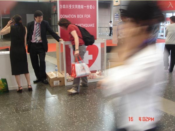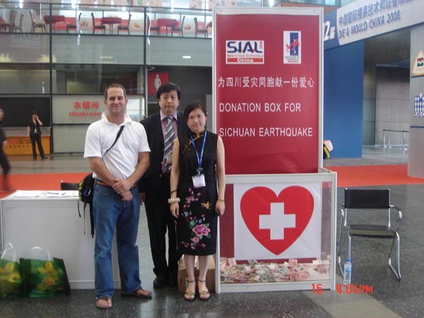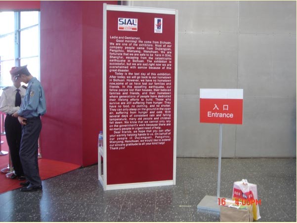Good morning! We come from Sichuan. We are one of the exhibitors. Most of our company people came from Dujiangyan, Pengzhou, Mianyang, Wenchuan. We are fortunate that we are safe to be here in SIAL Shanghai, escaping from the catastrophic earthquake in Sichuan. The exhibition is successful, but we are sad,right now we are overwhelmed with sorrow because of this great disaster.