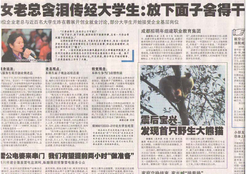 19th Dec 2008, Sichuan Sweetrip Food Co,. Ltd General Manager Anlei Qian attended the news release conference of cooperation of Sichuan trade companies and Universities/Colleges in Sichuan. In the conference, Ms. Anlei made the important point about ‘employment’ & ‘career starting’, and had discussion with all the CEO or general manager from the famous companies and 200 plus students. Sichuan Sweetrip Candy Shops has gained the great praise from the entrepreneurs and university professors, and also gained a big following from all the students.