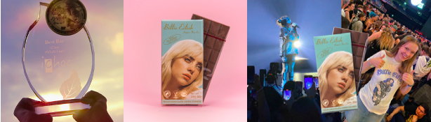 •德国 Sweetie Awards 的“年度最佳糖果” •加拿大国家营养奖“最佳排块巧克力 – 金奖” •英国 VIVA 奖“最好的素食巧克力” •与美国知名歌手,Billie Eilish 比莉·艾利什合作,为她设计了一款“Happier Than Ever”纯素食巧克力。