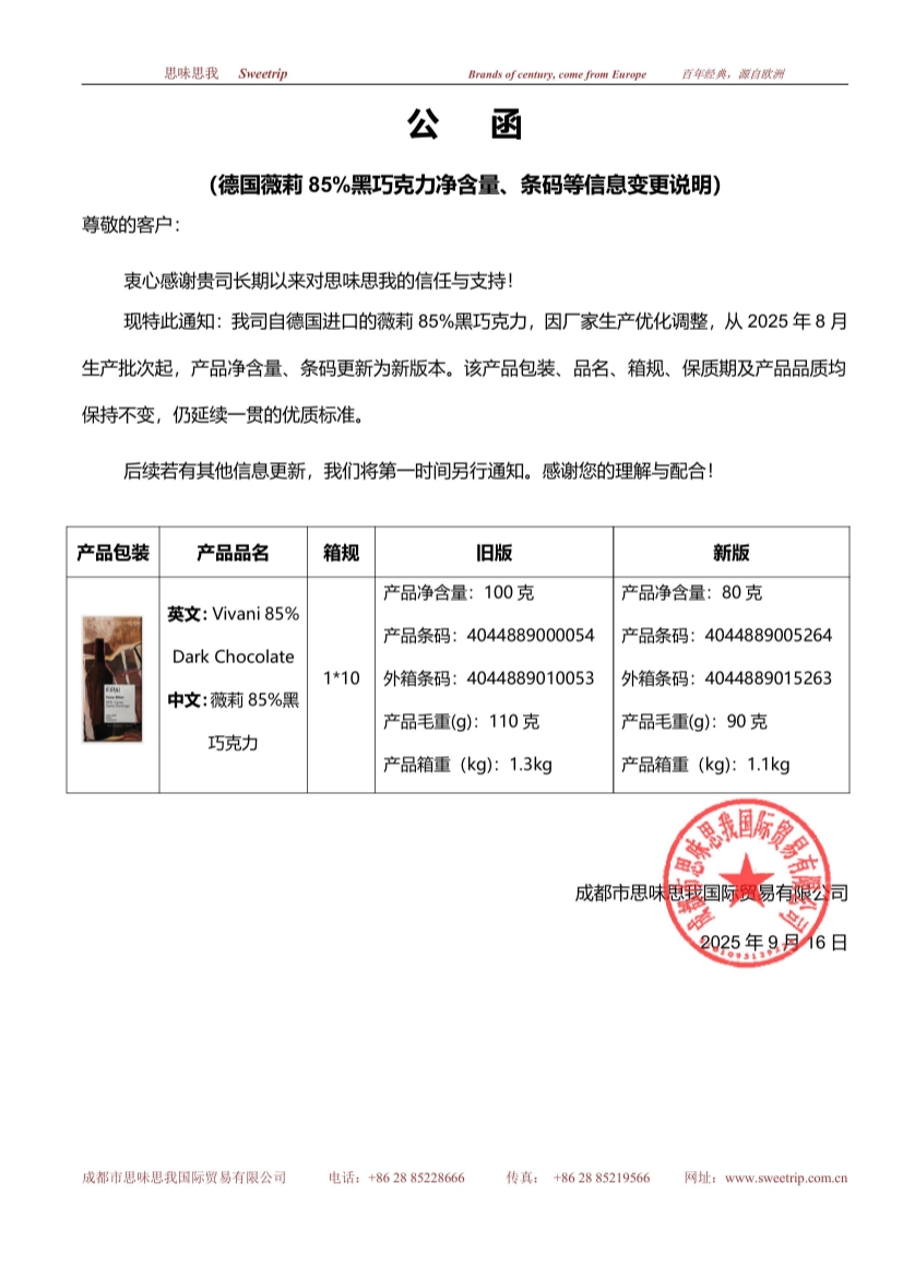 德国薇莉85%黑巧克力净含量、条码等信息变更说明