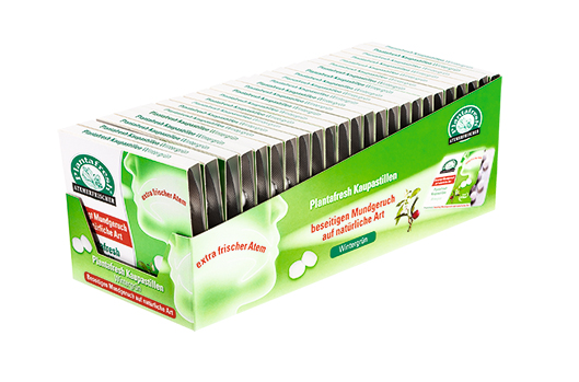 德国PIT公司1946年正式成立于德国巴伐利亚高原,至今已有70多年的历史。 PIT公司成立初始就只关注高品质食品领域,旗下产品包括:运动型,功能性糖果,食品补充剂,营养补充品等等。产品遍及欧洲各大超市,药房等等。 PIT Plantfresh(博朗)口气清新糖果是PIT旗下品牌之一。 适合情况:当您在约会前,或者吸烟,饮酒,吃了葱,蒜和其他比如服药后,随着Plantfresh(博朗)口气清新片在口中融化,各种口腔异味会立即被去除掉,效果立竿见影!此外Plantfresh(博朗)口气清新片不含薄荷脑,不影响味觉。 使用方法:将两片放在口中,嚼碎,即拥有清新的自然的口气。
