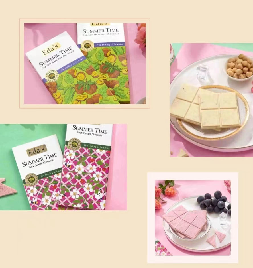 艾达的世界夏日时光巧克力 艾达的世界夏日时光巧克力系列,带来在炎热夏季享用冰爽巧克力的创意。浓郁的黑加仑味、香气醒人的海盐榛子味,带来夏季轻盈丝滑的美味巧克力。